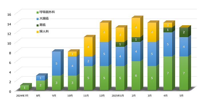 現在、呼吸器外科・大腸外科・胃外科・婦人科の4領域において、ロボット支援手術を保険診療で実施しており、2024年7月〜2025年5月末時点で114症例の手術を実施しました。今後、腎泌尿器外科や肝胆膵外科などでロボット支援手術の導入を検討しています。